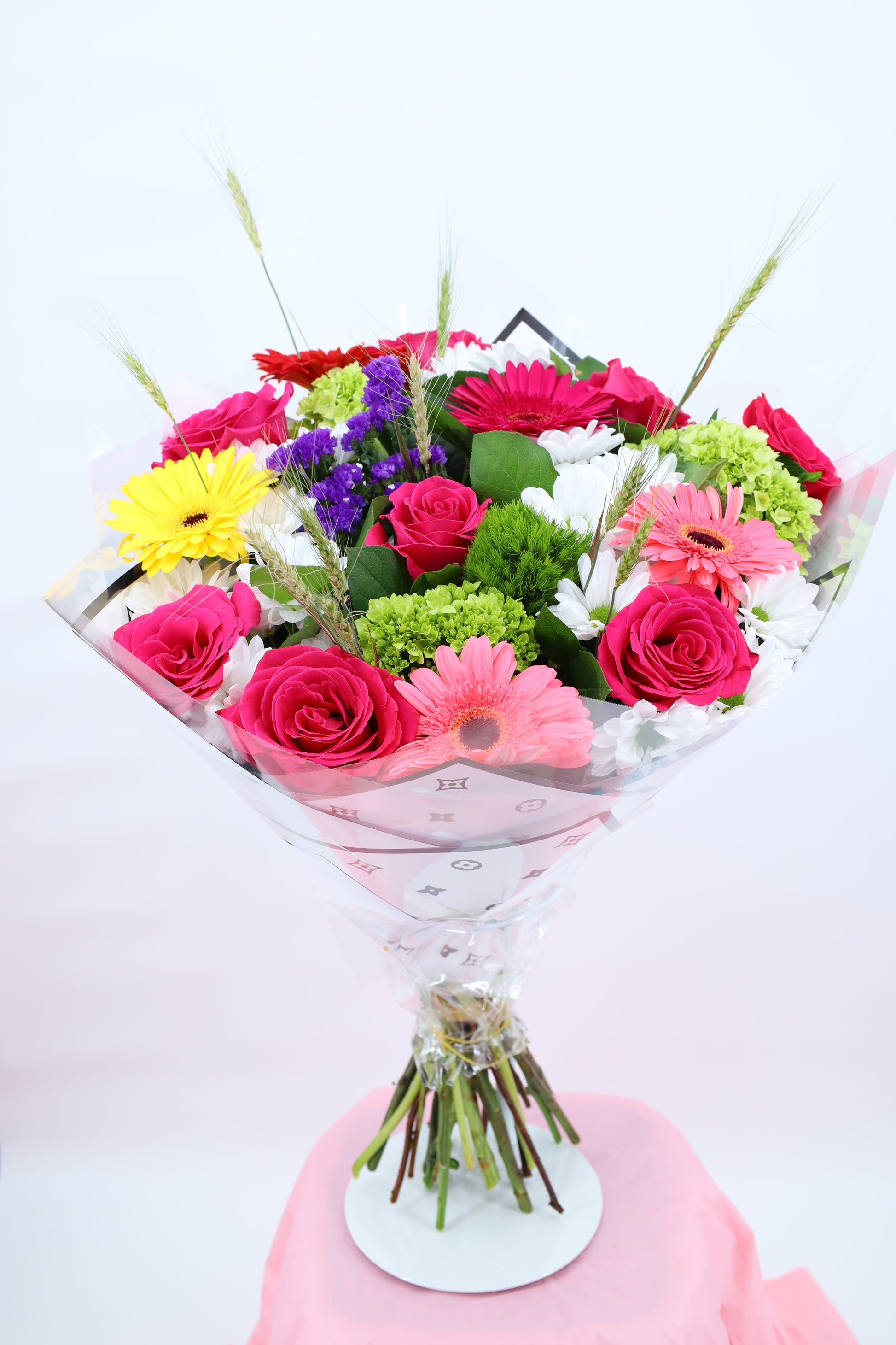 A lush and vibrant composition designed in our WFLOWER Signature style. This bouquet combines the elegance of Pink Floyd roses, the freshness of green hydrangea, and the cheerful charm of daisies, gerberas, and statice. Perfect for celebrating life’s happiest moments, this arrangement embodies European artistry with a modern twist. Handcrafted and delivered fresh by our skilled florists.
